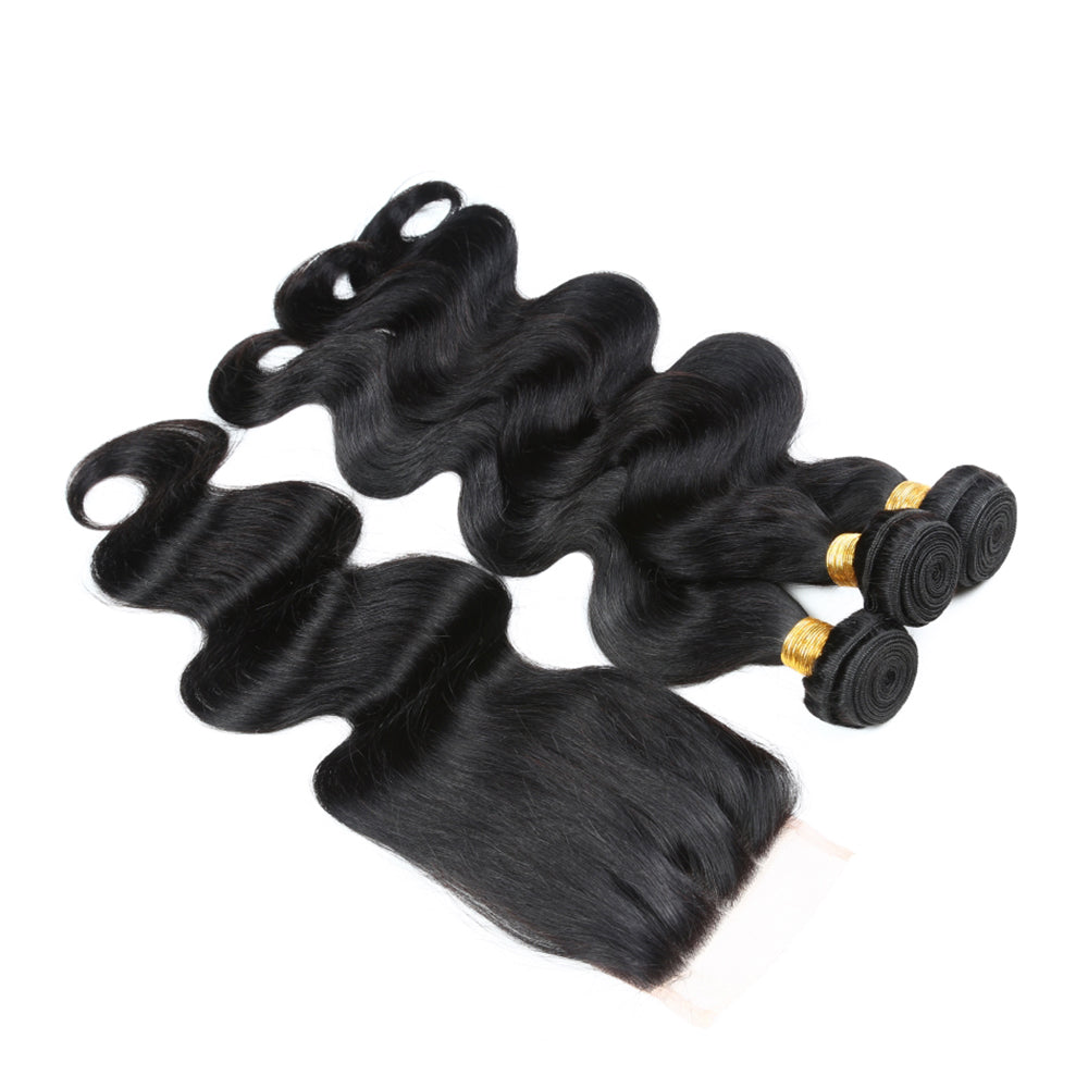3 Bundle Deals With 4*4 Transparent Closure Body Wave Virgin Human Hair Natural Black